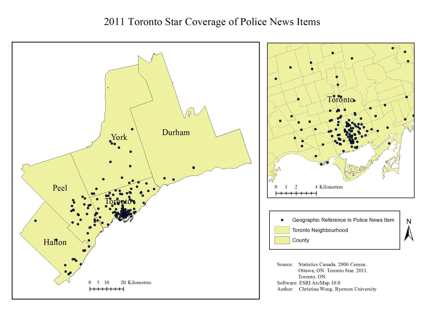 Another example of the role of maps in fostering a multidisciplinary approach to journalism research is evident in a Local News Research Project study of how the Greater Toronto Area is portrayed to readers of the Chinese-language newspaper Ming Pao (Lindgren, 2011). The content analysis revealed that news from China dominated the paper’s coverage (52 percent) while local news about the Greater Toronto Area accounted for only 8 percent of all content. The local news that did appear in the newspaper included significant amounts of reporting on festivals, celebrations, and community projects in areas of the GTA that are home to large concentrations of residents of Chinese origin. Crime reporting, however, was the top news subject overall and mapping analysis showed that it was reported on throughout the whole Greater Toronto Area and not just confined to incidents that took place in the Chinese enclaves or incidents involving people of Chinese origin. News about murder, mayhem, fires, accidents and injury accounted for one in every five local news items published in the newspaper. This emphasis on crime reporting raised concerns about the message conveyed to readers about personal safety and security in a metropolitan area where crime rates have been in steady decline.