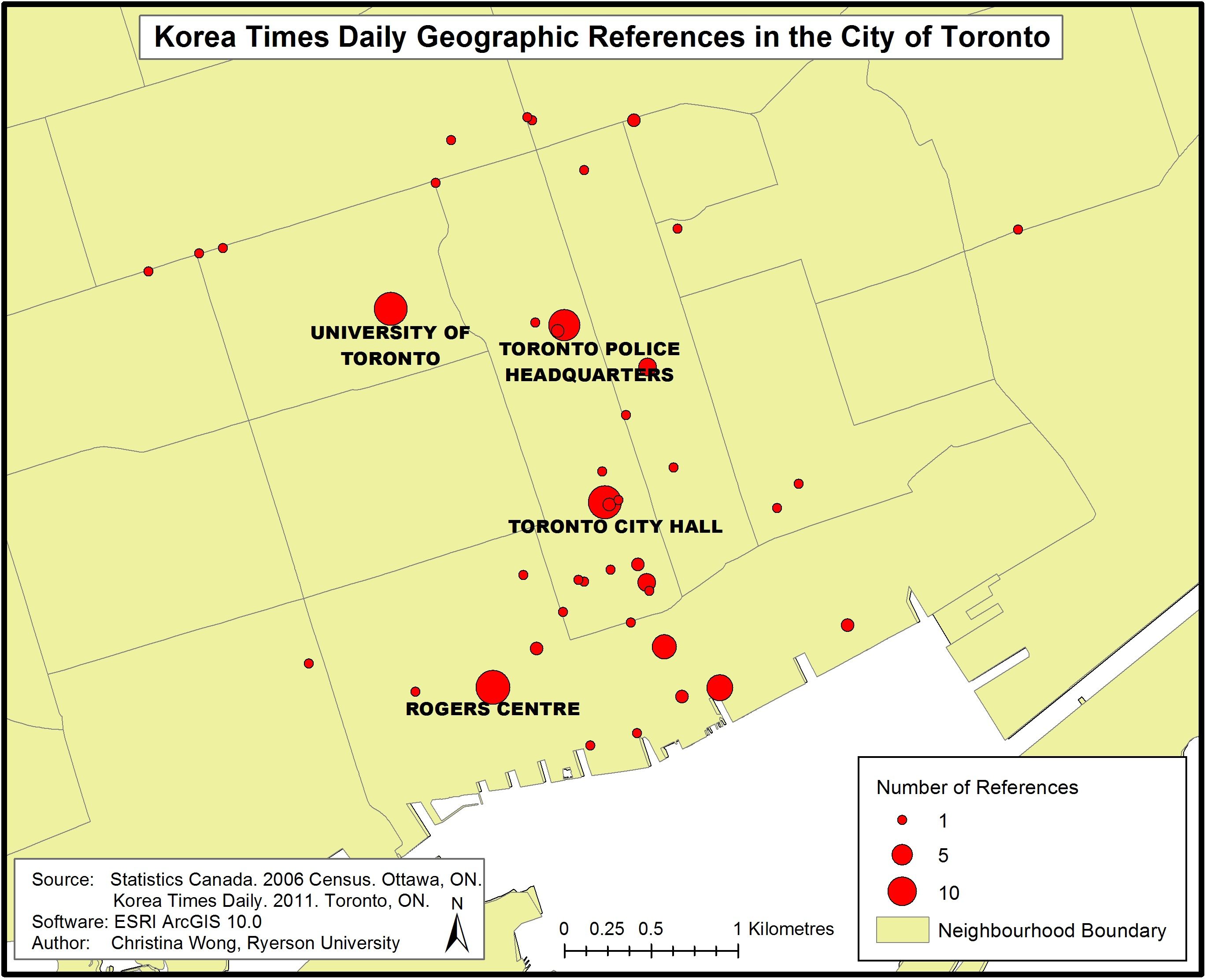 At the same time, sociological research on who journalists interview and where journalists go for stories and information could help researchers understand the emphasis that both newspapers seem to place on news in Toronto’s downtown core. Is it possible that The Star and Korea Times Daily, in this era of financially challenged newsrooms, both rely too heavily on easy-to-access elite sources at the many major institutions based in the city centre? Other maps generated by the project’s database can help answer this sort of question by illustrating the number of times a place is mentioned in a newspaper. Figure 3, for instance, shows that the most common sources of news for reporters at the Korea Times Daily are Toronto city hall, police headquarters, the University of Toronto, and the Rogers Centre professional sports venue. It is worth noting that all of these institutions or the organizations they house have sophisticated, formal public relations departments that make it relatively easy for reporters to get the information they need.