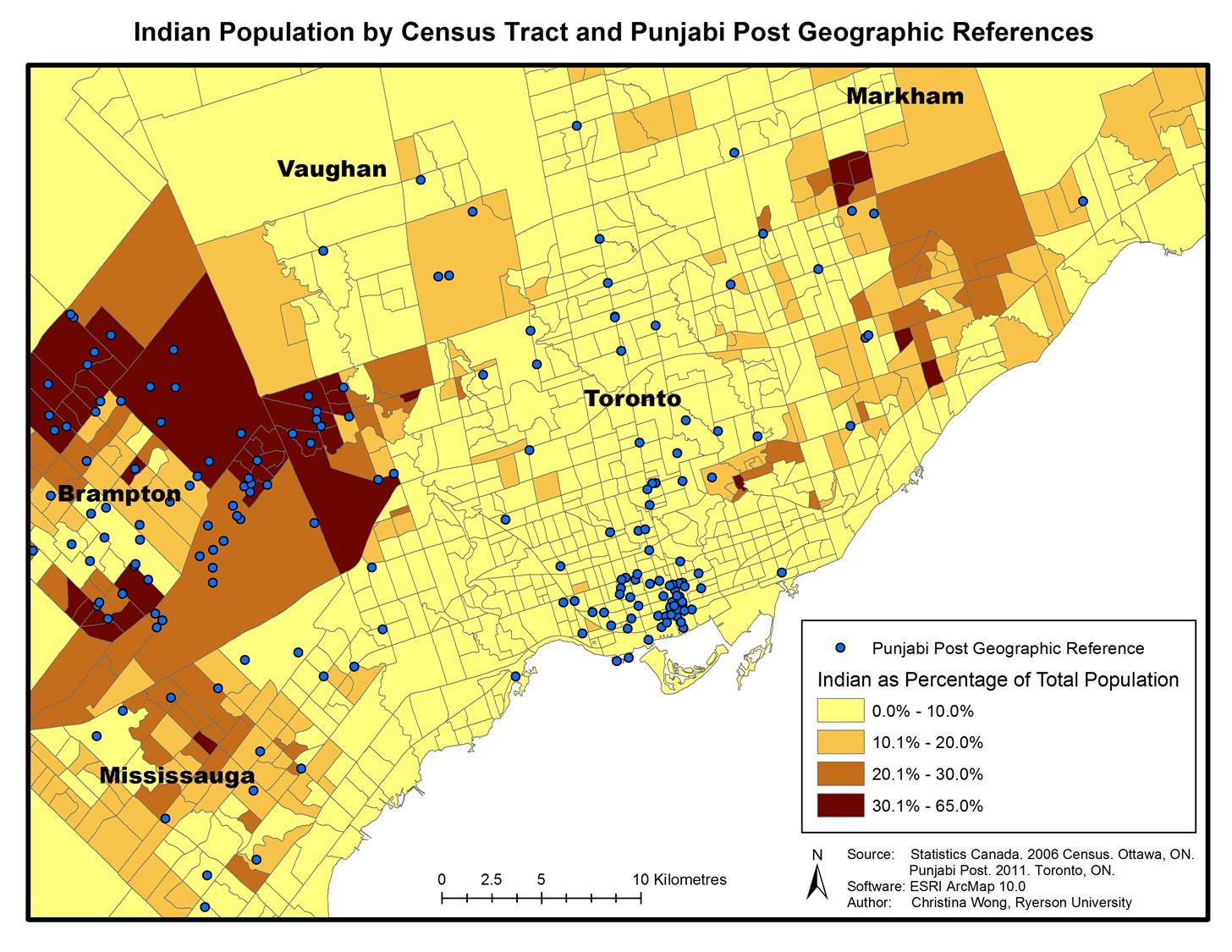 Figure 5, which shows the Canadian Punjabi Post’s news coverage combined with the proportion of the population of Indian ethnicity at the census tract level, further illustrates how data sets can be combined to generate research questions. Viewed through a cultural studies lens, a researcher might ask about the sense of place the paper conveys in its coverage of the Brampton area, which is home to many residents of Indian origin. This, in turn, complements sociological research that has established a link between the amount of local news available in ethnic media and the extent to which ethnic communities are integrated into broader society (Lin and Song, 2006).