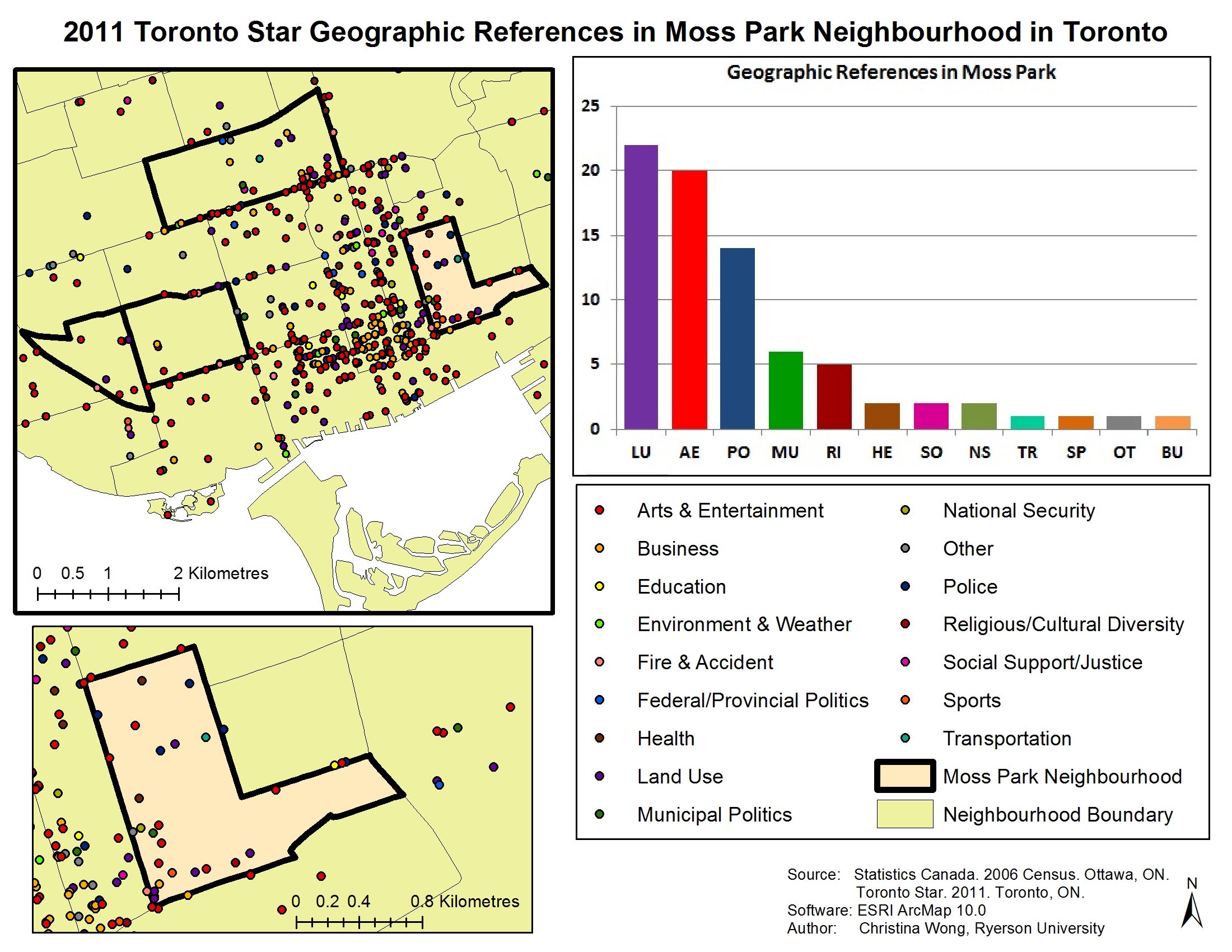 Maps also allow for the study of journalism at different geographic levels. The Local News Research Project has completed various detailed analyses of news coverage by neighbourhood. For instance, an analysis of the Toronto Star’s 2011 news coverage of the Moss Park neighbourhood showed that stories and photographs about the area focused on land use, arts and entertainment, and police stories (Figure 6). Moss Park is a neighbourhood that has experienced rapid gentrification over the past decade: the proportion of the neighbourhood earning more than $100,000 per year increased to 33.7 percent from 13.9 percent between 2001 and 2006 (City of Toronto, 2008). With the shift in neighbourhood demographics, what was once a predominantly low-income area has become the site of considerable condominium development, a change that clearly has attracted the attention of journalists.
