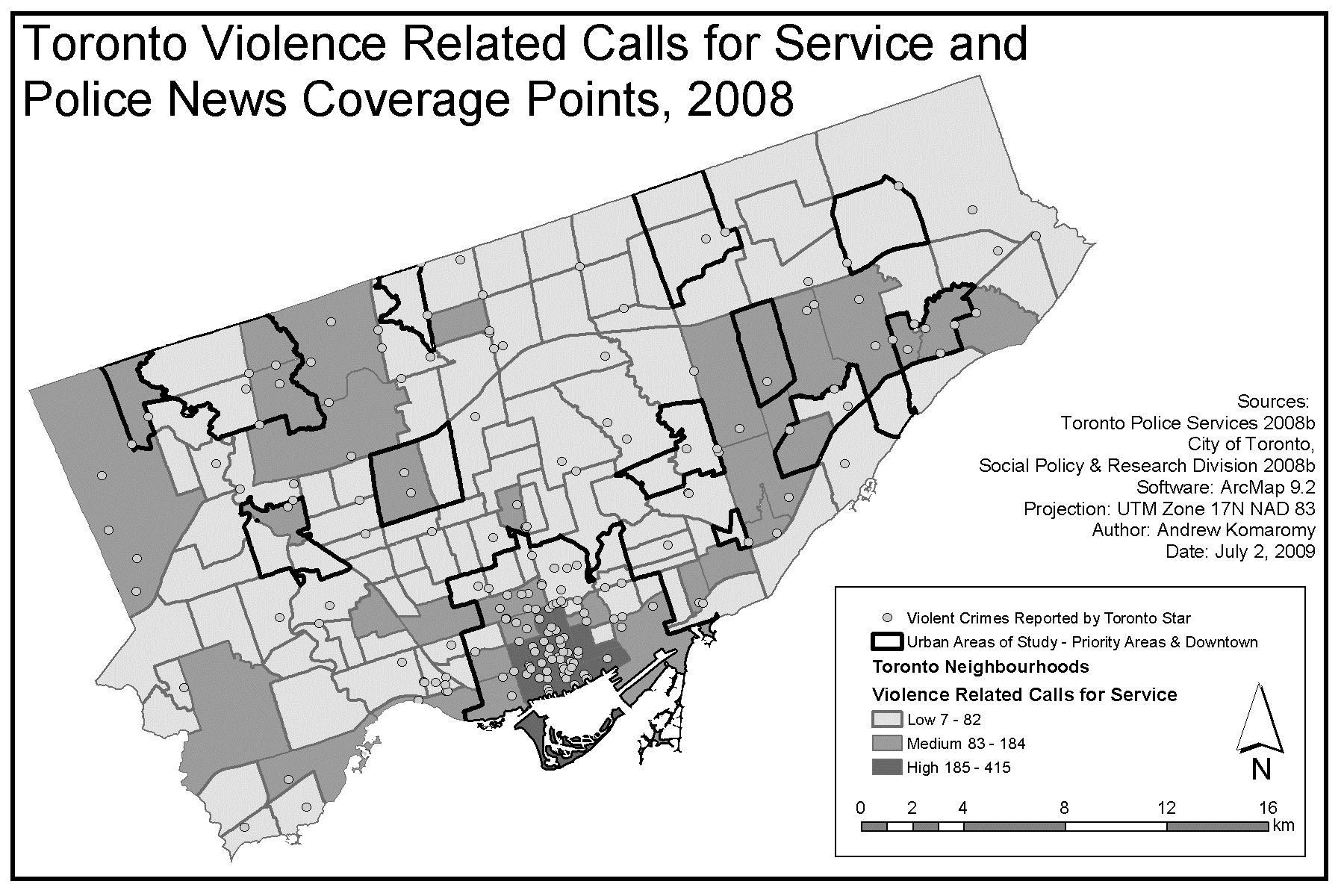 The use of news mapping to explore characterizations of neighbourhoods was explored more extensively in a study of Toronto’s disadvantaged areas conducted by The Local News Research Project. Mapping of the Toronto Star’s coverage of the 13 areas that city officials and social agencies identified as beset by socioeconomic problems and lacking in services found that the communities received little attention in the newspaper. In the news coverage that was published, crime and police-related stories and photographs were the most common subjects (Lindgren, 2009). Yet subsequent mapping that combined police and crime coverage with calls to the police for service related to violent incidents (a crime indicator) found little correlation between the two data sets (Figure 7). For this analysis, City of Toronto neighbourhoods were divided into three categories based on the number of violence-related calls for service originating from each neighbourhood during the study period. These categories, illustrated in Figure 7, showed that the neighbourhoods with the highest number of calls for service were located in the downtown core, while the 13 identified priority neighbourhoods were in the low and medium calls-for-service categories. Despite this, crime coverage was the number one subject of all news coverage for those areas. In the downtown area, meanwhile, where calls to police arising from violent incidents were the most frequent during the study period, arts, entertainment and sports dominated the news agenda. The study looked to newsgathering practices and concluded that crime dominates coverage of the priority-area neighbourhoods because little effort goes into covering other sorts of stories. This is due partly to how cheap and easy it is to gather crime news – a quick look at the latest press releases on the website of the Toronto Police Service website can generate multiple stories. But it also has to do with the dearth of on-the-ground reporters based in the city’s troubled neighbourhoods, where they can tap into events and issues and tell stories beyond the crime beat.