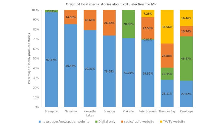 Research I conducted with Jaigris Hodson at Royal Roads University on how the races for local MPs were covered by respective local media during the 2015 federal election found that newspapers produced most of the stories in six of the eight places we studied.
